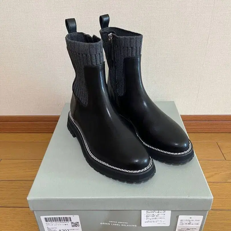 자동 번역되었어요. 원문보기가죽과 니트의 콤비네이션, 사이드 고어 디자인의 부츠.