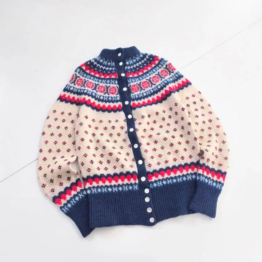 모크넥 노르딕 페어아일 패턴 니트 가디건 S5 전통적인 노르딕 무늬 (페어아일 패턴)가 눈길을 끄는 두툼한 니트 가디건입니다. 화이트 베이스에 네이비와 레드의 배색이 매우 고급스러우며, 어딘가 그리운 레트로한 분위기를 풍깁니다. 목까지 버튼을 채울 수 있는 사양으로 방한성도 뛰어납니다. 가슴 너비 40cm 기장 60cm 소매 길이 79cm No11