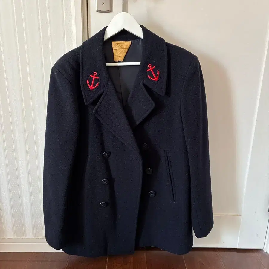 네이비 더블 브레스트 피코트, 빨간색 닻 자수 포함.