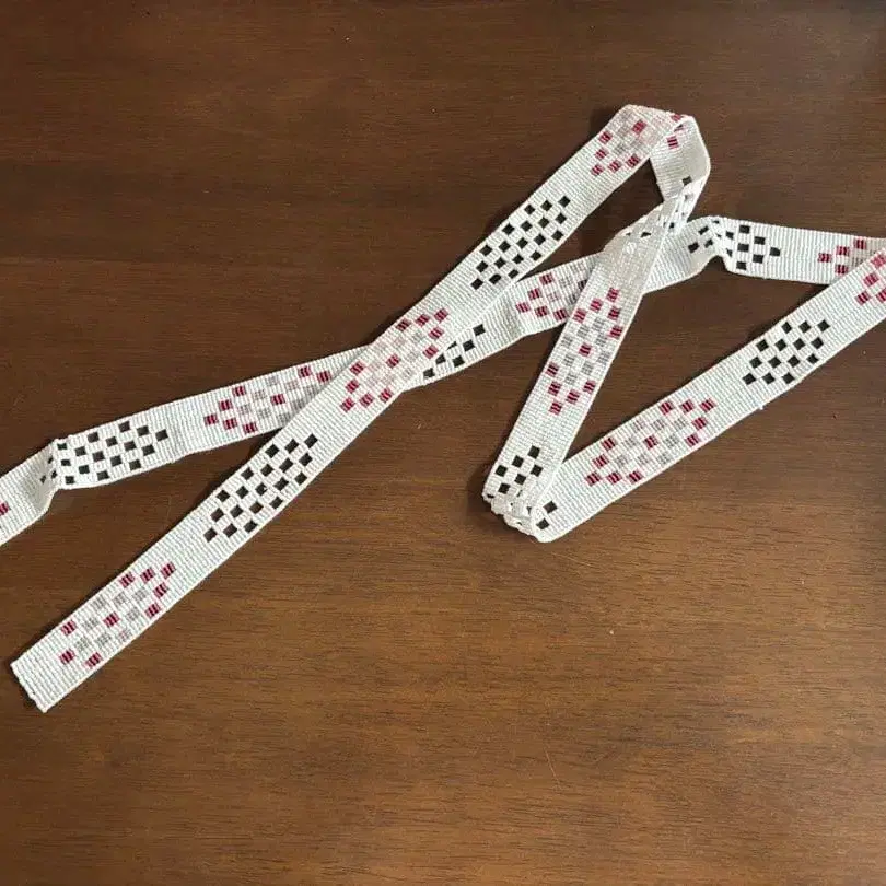 핸드메이드 비즈 목걸이입니다. 길이는 약 1m입니다. 화이트 베이스에 블랙과 빨간색 무늬가 특징인 리본 목걸이. - 디자인: 화이트 베이스에 블랙과 빨간색 무늬가 들어간 리본 형태의 목걸이 - 스타일: 캐주얼 - 소재: 리본 소재 - 길이: 조정 가능 방문해 주셔서 감사합니다.