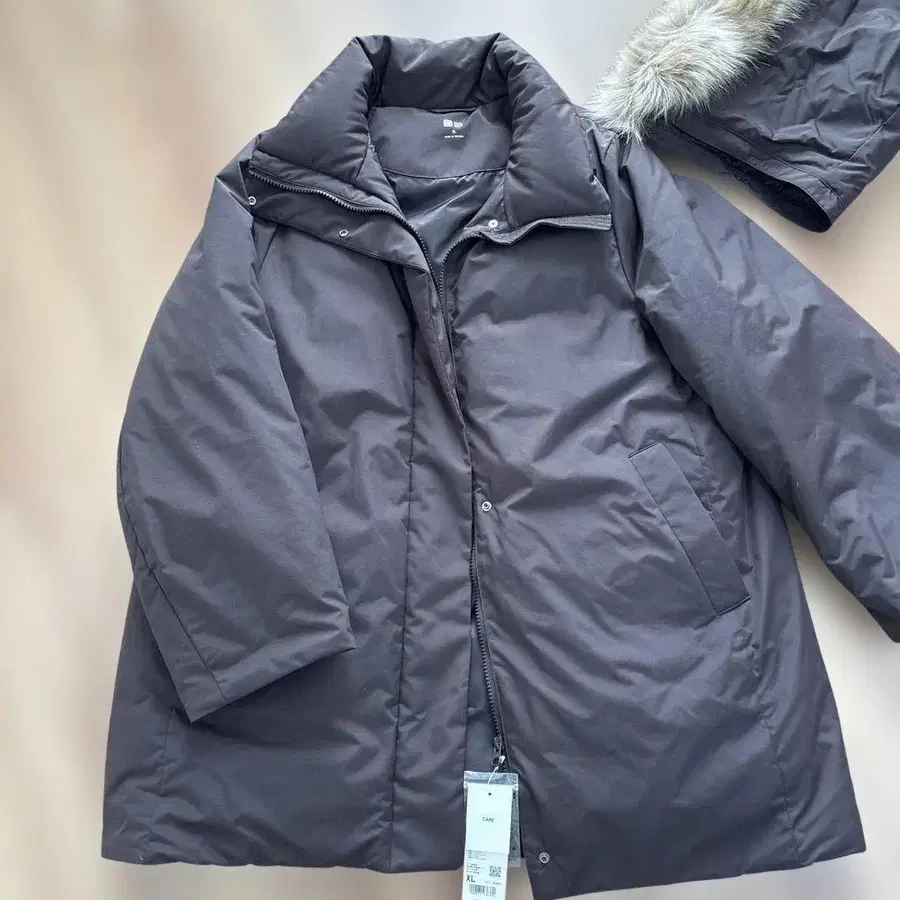 다크 브라운 색상의 UNIQLO 하이브리드 다운 코트, XL 사이즈.