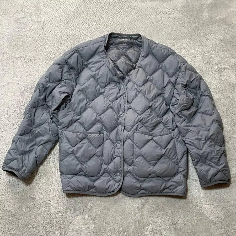인기 많은 릴랙스 다운 자켓의 블루 그레이 색상입니다.