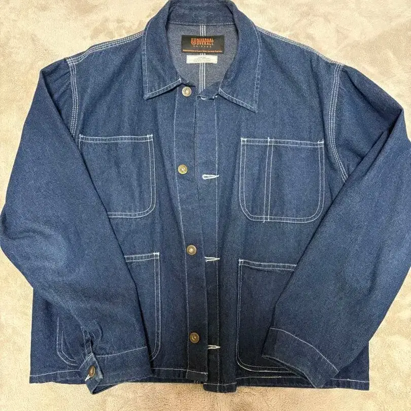 다크 블루 색상의 데님 자켓입니다. 프론트 포켓이 있어 실용적입니다. - 브랜드: UNIVERSAL OVERALL - 색상: 다크 블루 - 소재: 코튼 98%, 폴리우레탄 2% - 스타일: 데님 자켓 - 특징: 프론트 포켓 부착 방문해 주셔서 감사합니다.