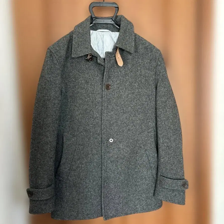 울 소재의 그레이 색상 피코트, 단추식, 스트라이프 패턴 안감 부착 기장 약 71 가슴 너비 약 53 어깨 너비 약 44 소매 길이 약 62 used로 구매 1번도 입지 않았습니다