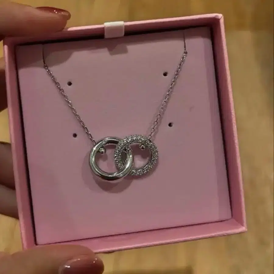 두 개의 링이 겹쳐지고 스톤으로 장식된 실버 색상의 목걸이. - 디자인: 두 개의 링이 겹쳐진 디자인 - 소재: 실버 색상의 금속제 - 장식: 스톤이 달린 링 - 박스: 핑크 박스 포함 방문해 주셔서 감사합니다.