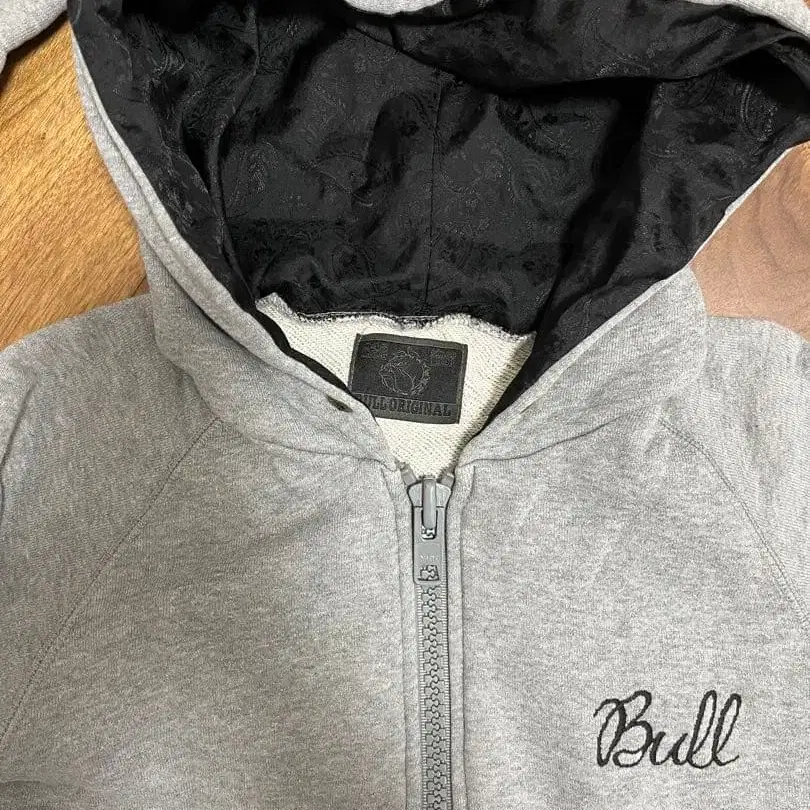 프론트에 자수 'Bull', 백에 반다나 프린트 디자인이 특징인 그레이 색상의 후드티입니다.