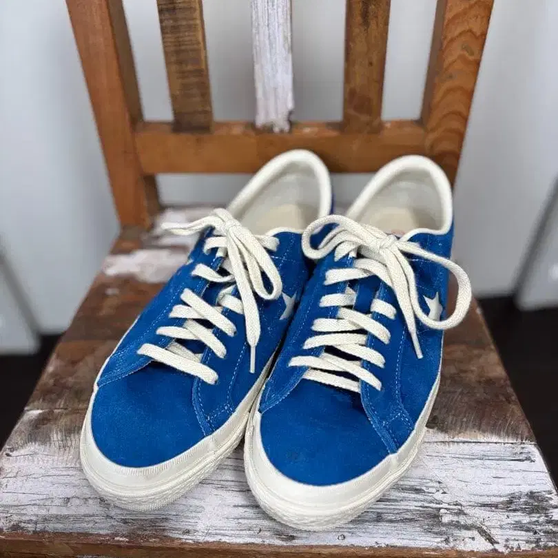 CONVERSE / ONE STAR J SUEDE 컬러: 블루 사이즈: 5 ( 24cm ) 가격: 24,200엔 ( 세금 포함 ) [ ONE STAR ] 50주년 사이즈 - 24cm 컬러 - 블루 실루엣 - 로우컷/OX 재질 - 스웨이드 신발끈에 약간 블루 이염이 있습니다. 몇 번 사용. 별 하나가 특징인 MADE IN JAPAN 일본산 소재를 사용한 한정판 생산. 레어 가치가 높은, 특별한 느낌의 한 켤레입니다. ※ 상자는 처분했기 때문에, 다른 상자에 넣어 발송하겠습니다.