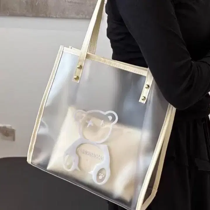 투명한 플라스틱 소재의 대용량 숄더백, 베어 디자인 포함. - 디자인: 투명한 플라스틱 소재에 베어 디자인 - 부속품: 소형 파우치 포함 - 사이즈: 대용량으로 일상 사용에 최적 - 색상: 클리어와 아이보리 콤비네이션 방문해 주셔서 감사합니다.