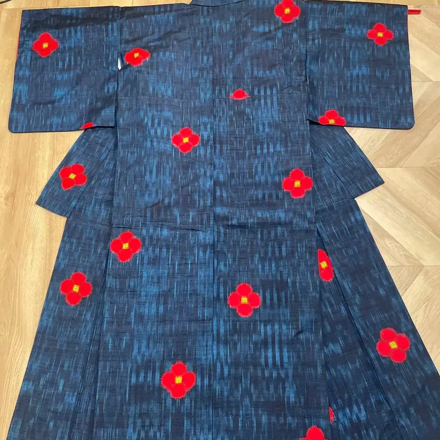 네이비 컬러와 파란색 바탕에 옐로우 컬러 꽃술과 빨간색 꽃잎이 눈길을 끄는 멋진 기모노입니다.