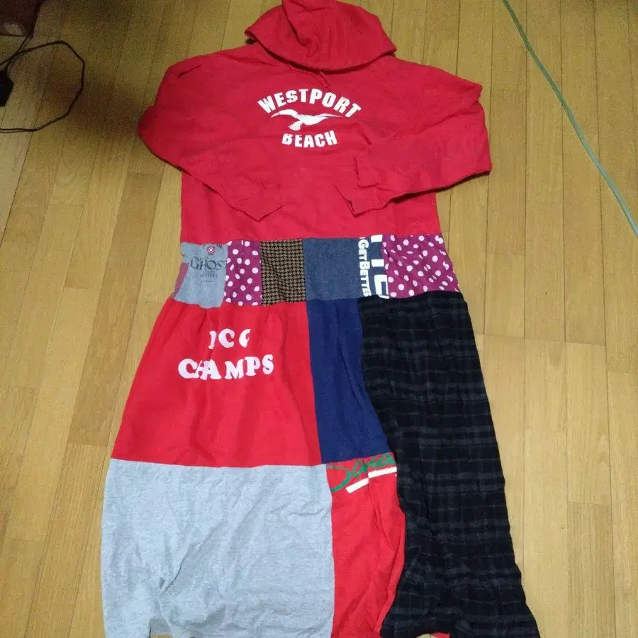 구제 의류 리메이크 후드 부착 패치워크 원피스 빨간색