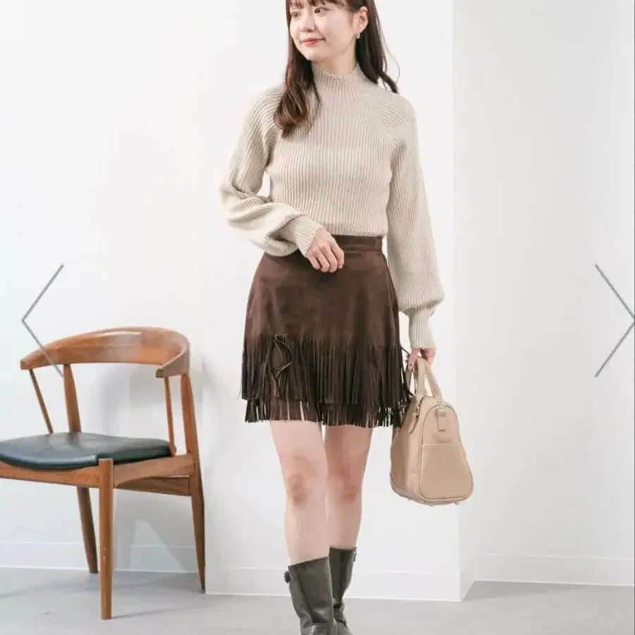 밑단의 프린지가 시선을 사로잡는 스웨이드 스커트