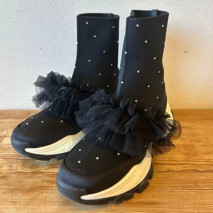 펄과 튤 프릴이 특징적인 블랙 부츠.