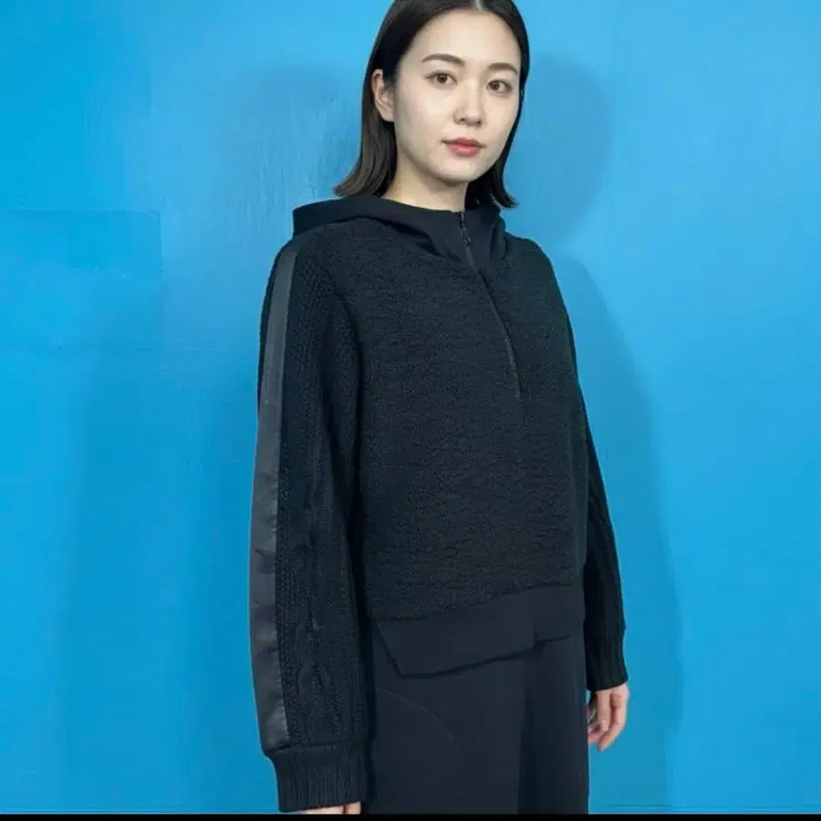 기하학 패턴의 파란 니트 원피스