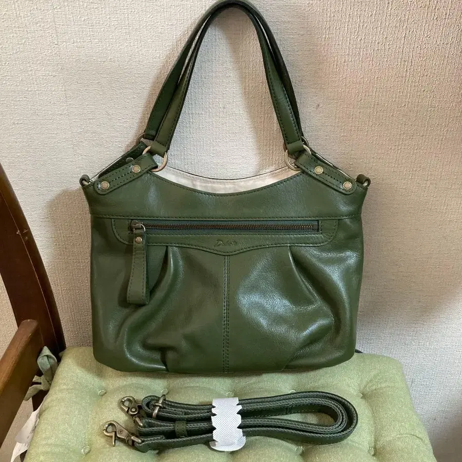 올리브 그린 색상의 가죽 숄더백입니다. 탈부착 가능한 스트랩이 있으며, 3개의 포켓이 있습니다.