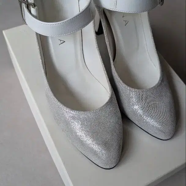 실버와 화이트 색상의 앵클 스트랩 하이힐.