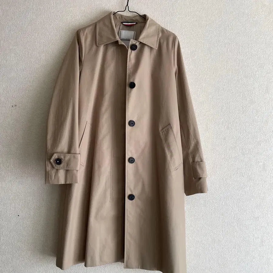베이지 색상의 버튼이 달린 롱 코트, 새틴 안감 마감. - 색상: 베이지 - 디자인: 버튼 포함, 롱 기장 - 안쪽 소재: 새틴 마감 - 소매: 버튼 포함 사이즈 표기는 34이지만, 매장에서는 M 사이즈라고 안내받았습니다. 방문해 주셔서 감사합니다. 사이즈 - M