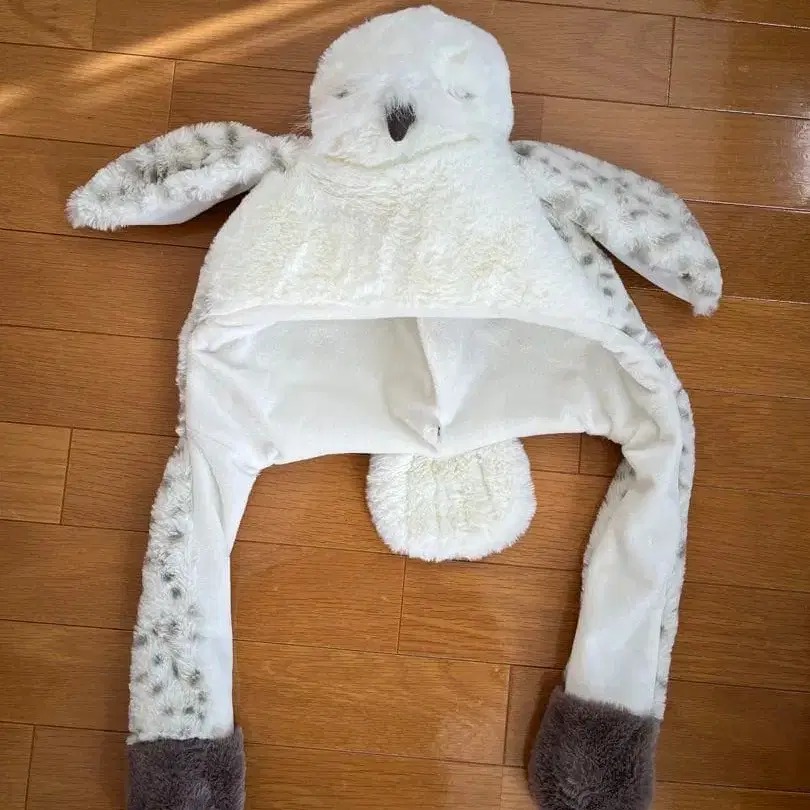 올빼미 디자인의 복슬복슬한 모자, 누르면 깃털이 움직이는 기믹 포함.