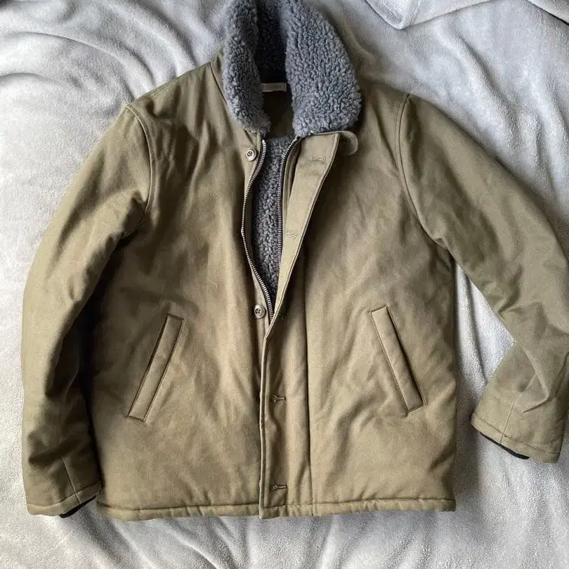 플리스 안감 카키색 자켓, 지퍼가 달린 캐주얼 스타일.
