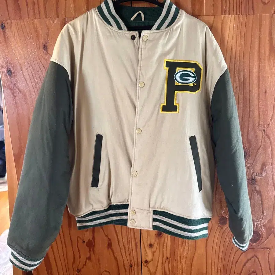 패커스 로고가 특징인 바시티 자켓, 퀼팅 안감 포함. - 브랜드: Logo 7 - 색상: 베이지/그린 - 디자인: 패커스 로고 - 스타일: 바시티 자켓 - 소재: 퀼팅 안감 방문해 주셔서 감사합니다. 사이즈 - L