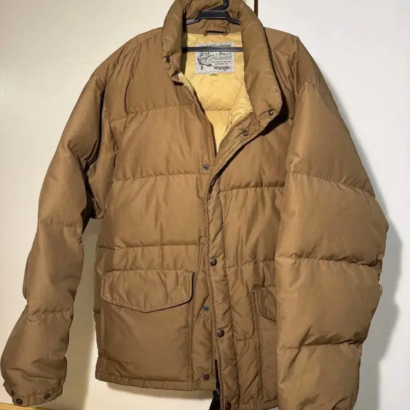 브라운 다운 자켓, 앞면에 2개의 포켓 부착.