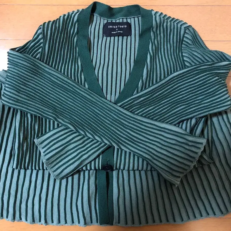 UNITED TOKYO / 유나이티드 도쿄 롱 가디건 색상은 그린 몇 번 착용했습니다. 얼룩은 특별히 없지만 밑단 부분의 리브가 약간 늘어난 느낌이 듭니다. 자택 보관 중인 상품이므로, 이해해 주시는 분의 구매를 부탁드립니다. 두께를 줄여 포장하므로, 접힌 자국이 생길 가능성이 있습니다. 포장은 리사이클 자재 등을 사용하겠습니다. 가격 인하 불가입니다.