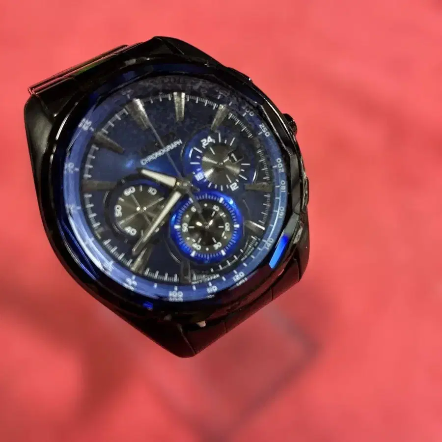 블랙과 블루의 크로노그래프, 스테인리스 스틸 소재의 링크 밴드.
