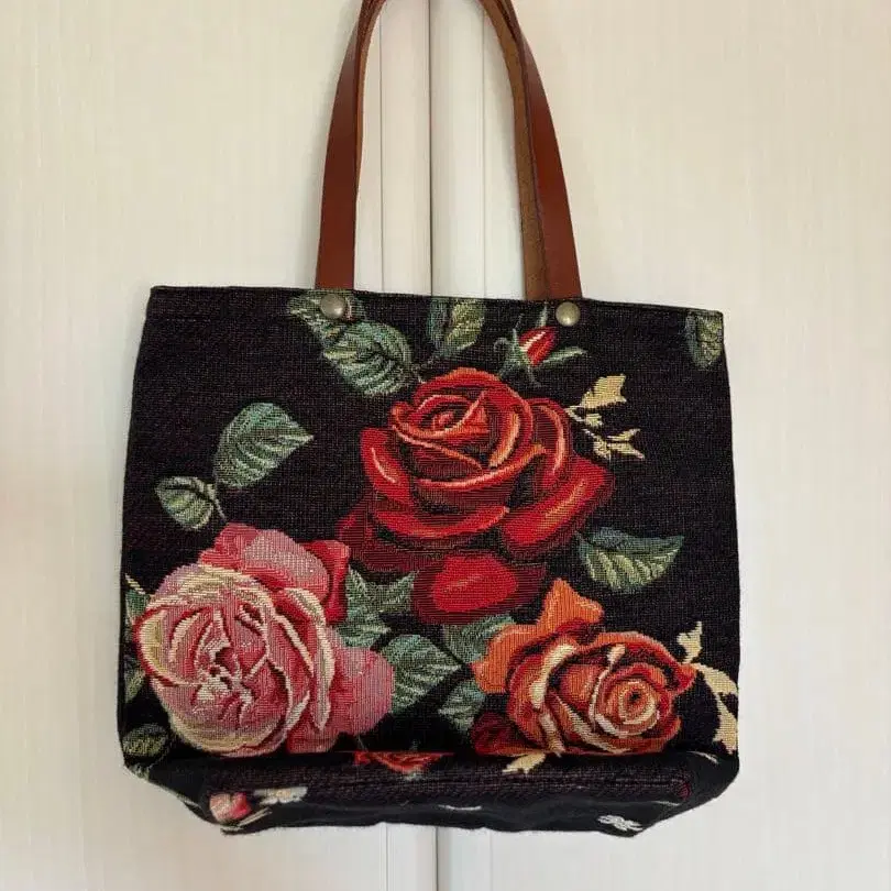 장미 자수가 놓인 블랙 베이스 핸드백, 카모플라쥬 패턴의 내부. - 디자인: 장미 자수 - 색상: 블랙 베이스에 빨간색과 핑크색 장미 - 내부 디자인: 카모플라쥬 패턴의 내부 - 손잡이 소재: 합성 피혁 - 크기: 세로 24cm, 가로 30cm, 폭 17cm 방문해 주셔서 감사합니다.