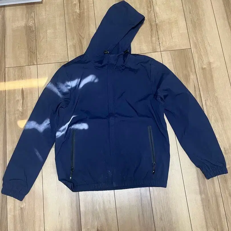 심플한 디자인의 네이비 나일론 자켓, 후드 부착 및 지퍼 포켓 있음. - 색상: 네이비 - 후드: 후드 부착 - 포켓: 지퍼 포켓 부착 - 디자인: 심플한 디자인 - 소매: 긴팔 방문해 주셔서 감사합니다. 어깨 너비/가슴 너비/소매 길이/기장 어깨 너비 - 45cm 가슴 너비 - 53cm 소매 길이 - 62cm 기장 - 65cm 컬러 - 네이비 계열 얼룩, 찢김, 냄새 등 - 없음