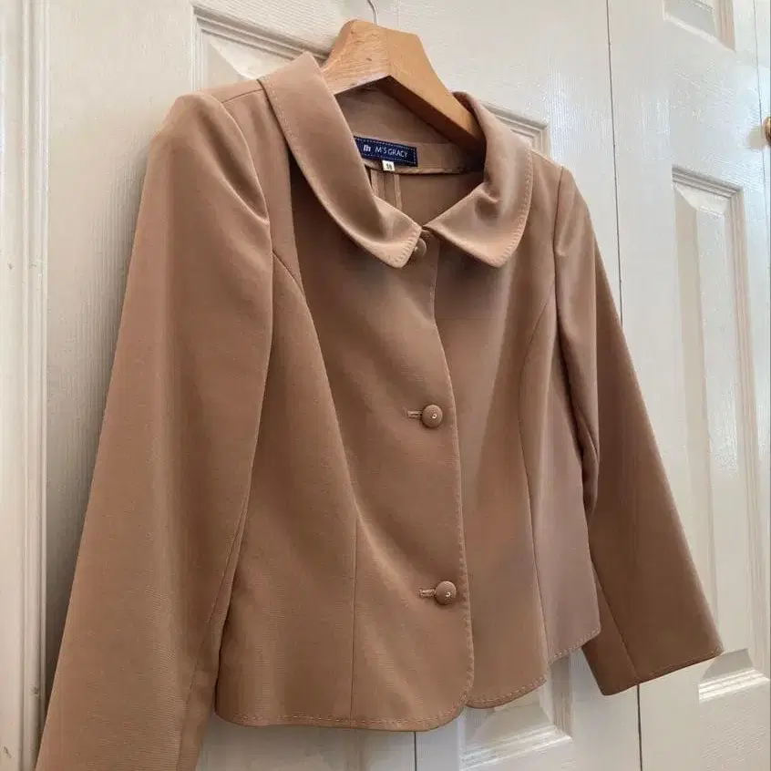 자동 번역되었어요. 원문보기베이지 색상의 테일러드 자켓, 앞면 단추식, 사이즈 38.