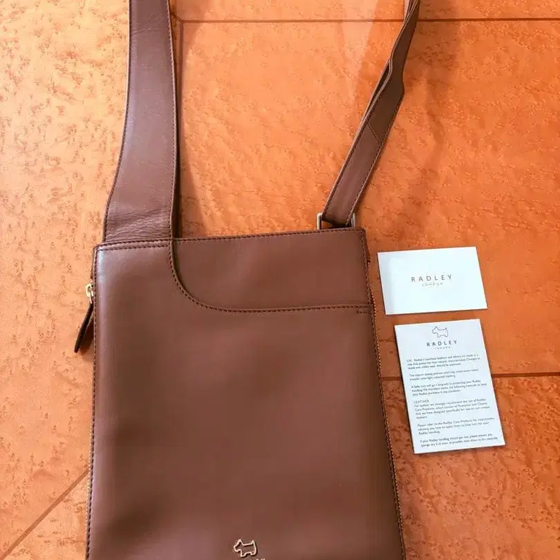 고품질의 가죽 소재 브라운 숄더백, 지퍼 포켓 부착.