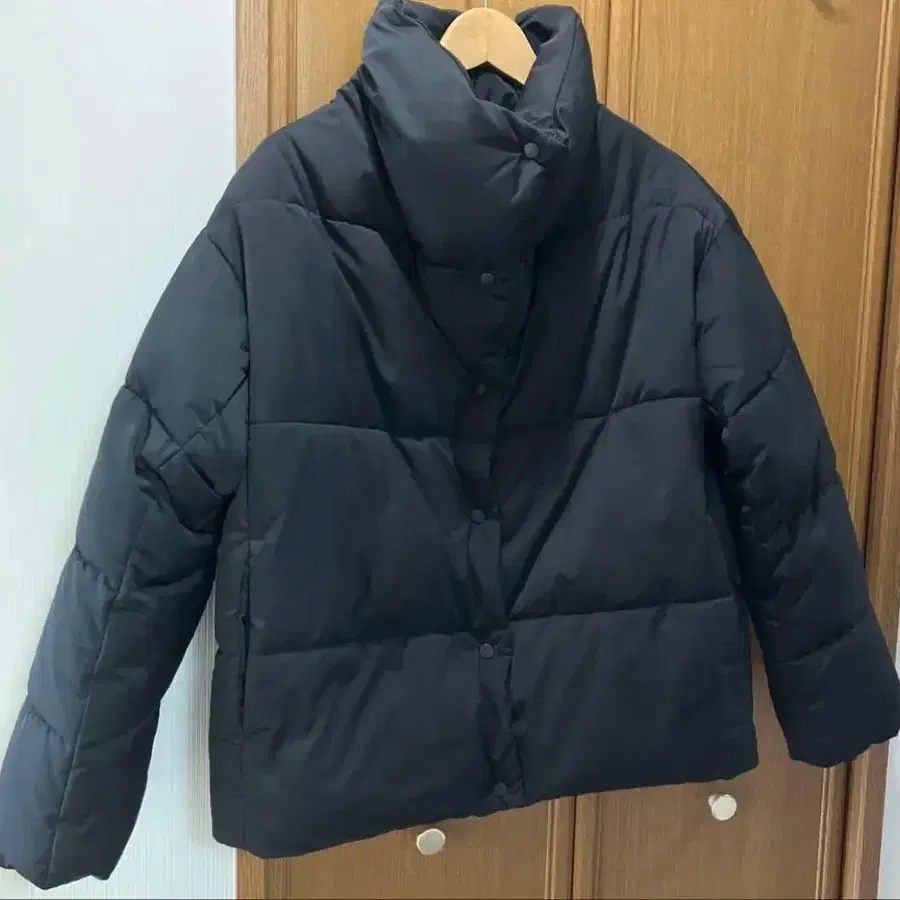 높은 옷깃과 스냅 버튼이 특징인 블랙 다운 자켓.