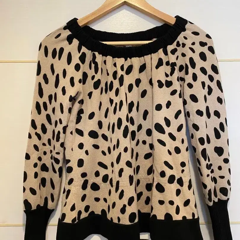 베이지와 블랙 도트 무늬의 오프숄더 스웨터. 모 100%로 따뜻하며, 벌룬 슬리브 디자인이 특징입니다. - 색상: 베이지와 블랙 도트 무늬 - 사이즈: II - 소재: 모 100% - 디자인: 오프숄더, 벌룬 슬리브 방문해 주셔서 감사합니다.