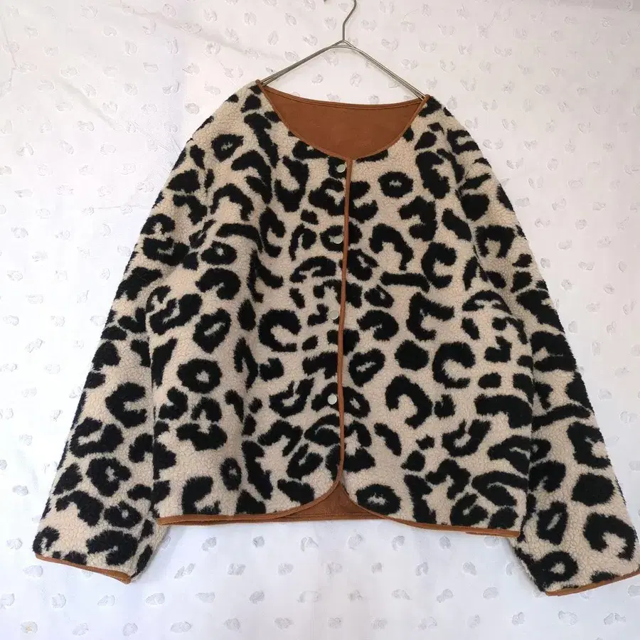 레오파드 무늬 보아 자켓, 스냅 버튼이 있어 따뜻하며 캐주얼 스타일에 최적입니다.