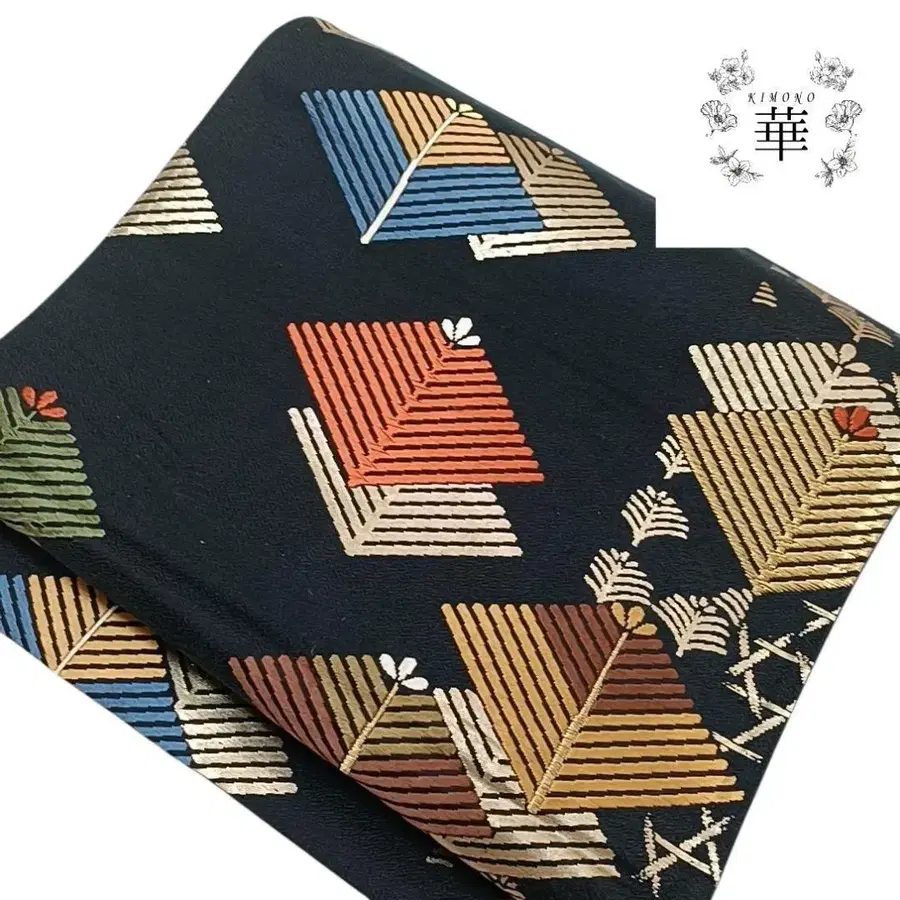 1040 화 후쿠로 오비 순수 실크 블랙 후쿠로 오비 소나무 잎