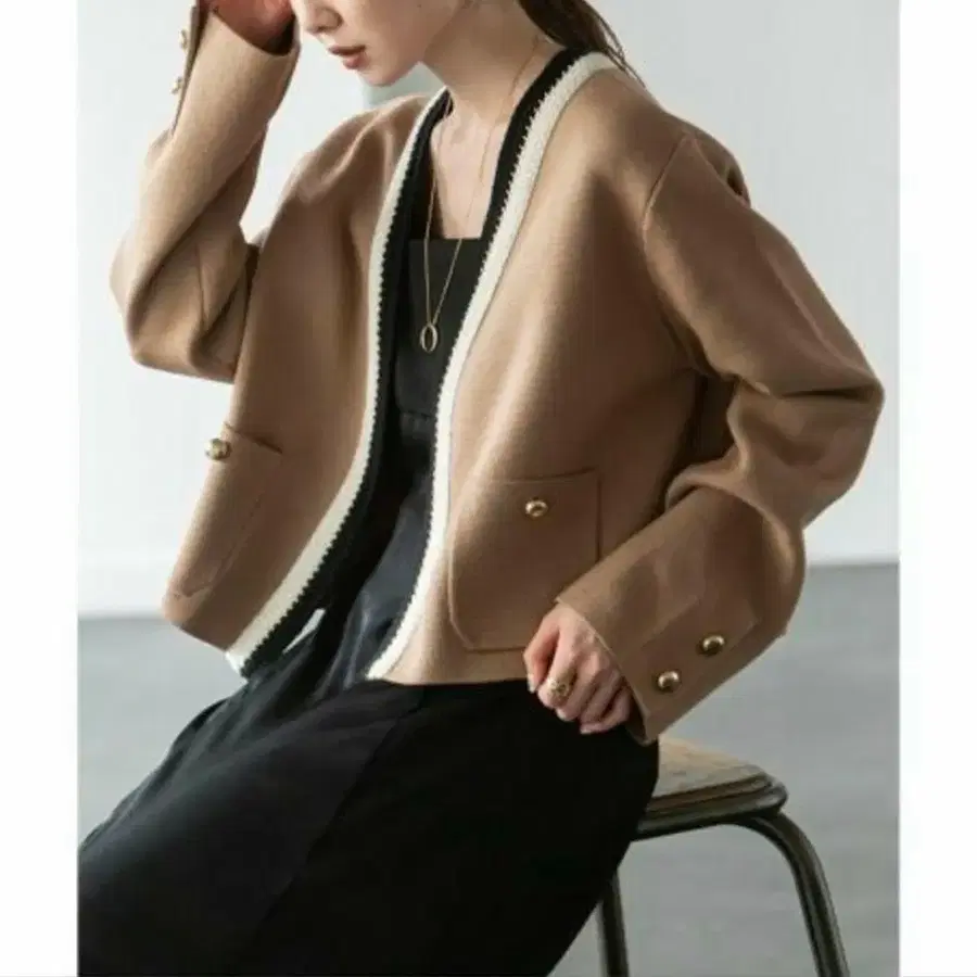배색 트리밍 밀라노 리브 숏 자켓입니다.