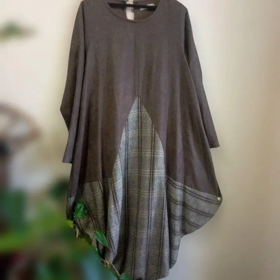 비대칭 디자인의 긴팔 원피스, 체크 무늬 절개가 특징. 기장 105cm, 가슴둘레 106cm, 소매 길이 58cm - 색상: 그레이 - 소재: 코튼, 폴리에스테르 혼합 - 디자인: 비대칭, 체크 무늬 절개 - 소매: 긴팔 - 넥라인: 라운드넥 - 특징: 버튼이 있는 밑단 디자인 방문해 주셔서 감사합니다.