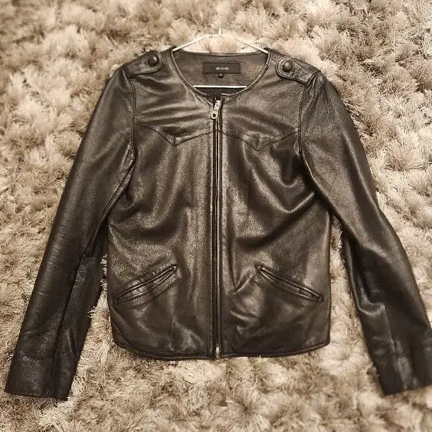 지퍼식 블랙 가죽 라이더 자켓, 어깨 버튼이 있어 스타일리시합니다.