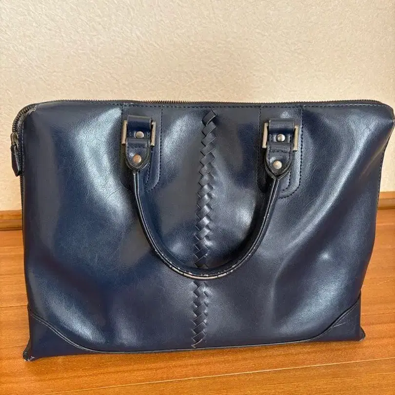 네이비 색상의 가죽 비즈니스 백, 뜨개질 디자인이 특징입니다. - 색상: 네이비 - 디자인: 뜨개질 디자인 - 소재: 가죽 - 핸들 상태: 마찰 있음 방문해 주셔서 감사합니다.