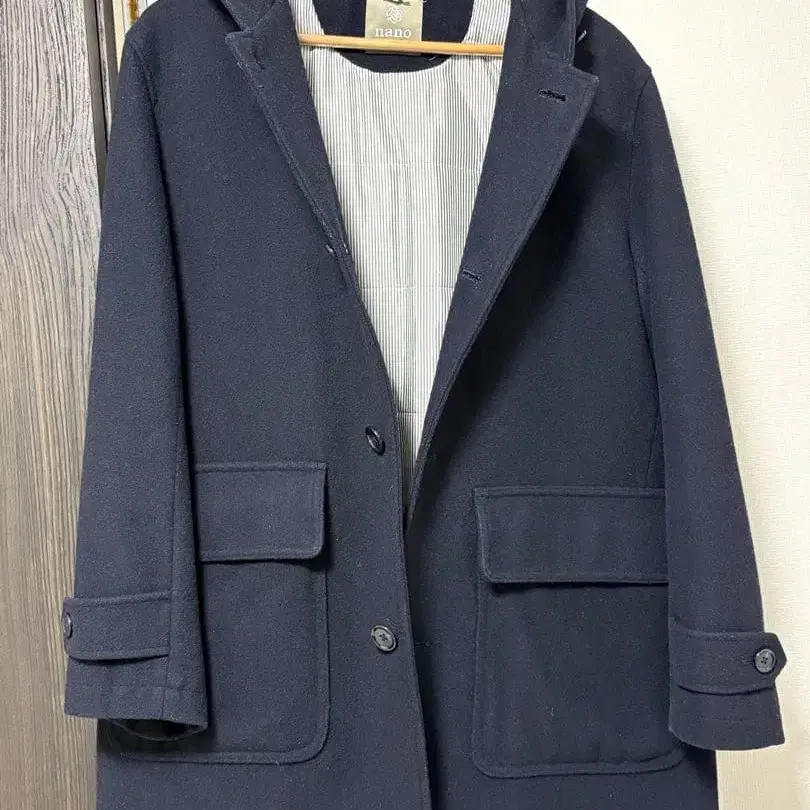 네이비 색상의 울 혼방 소재로, 후드 부착이 가능한 스타일리시한 코트.