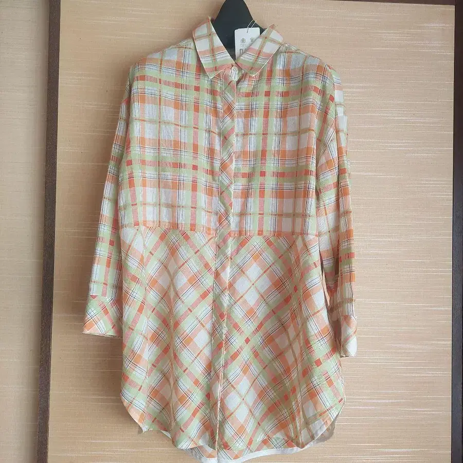 [ 새상품 ] DAKS 블라우스 튜닉 체크 38 오렌지, 연두색, 브라운 체크 60,500엔 뒷면이 둥글고 길며 숨겨진 버튼 앞면 목 아래부터 밑단까지 약 67cm 허리 끈 포함