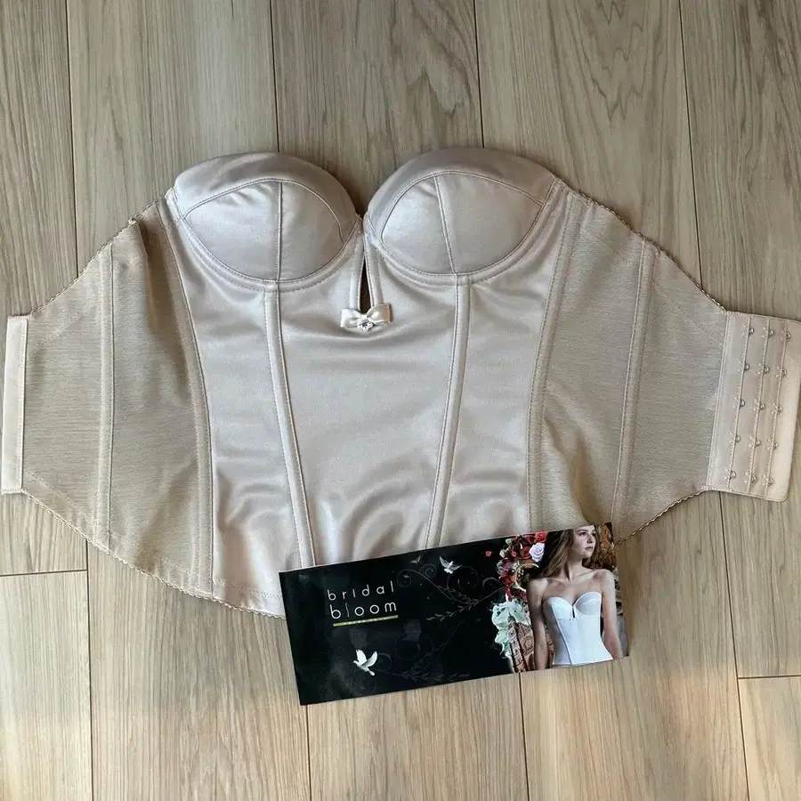 스트랩리스 디자인의 베이지 코르셋입니다.