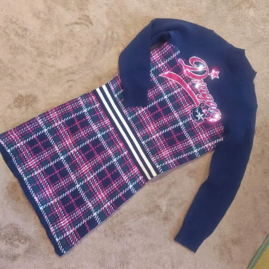 스팽글 자수가 들어간 네이비 체크 무늬 원피스, 라운드넥과 긴팔 디자인. - 색상: 네이비, 체크 무늬 - 디자인: 라운드넥, 긴팔, 장식 포함 - 특징: 스팽글 자수, 스트라이프 포함 사이즈 2 가슴 너비 45cm 총길이 93cm (스커트 길이 38cm) 방문해 주셔서 감사합니다.