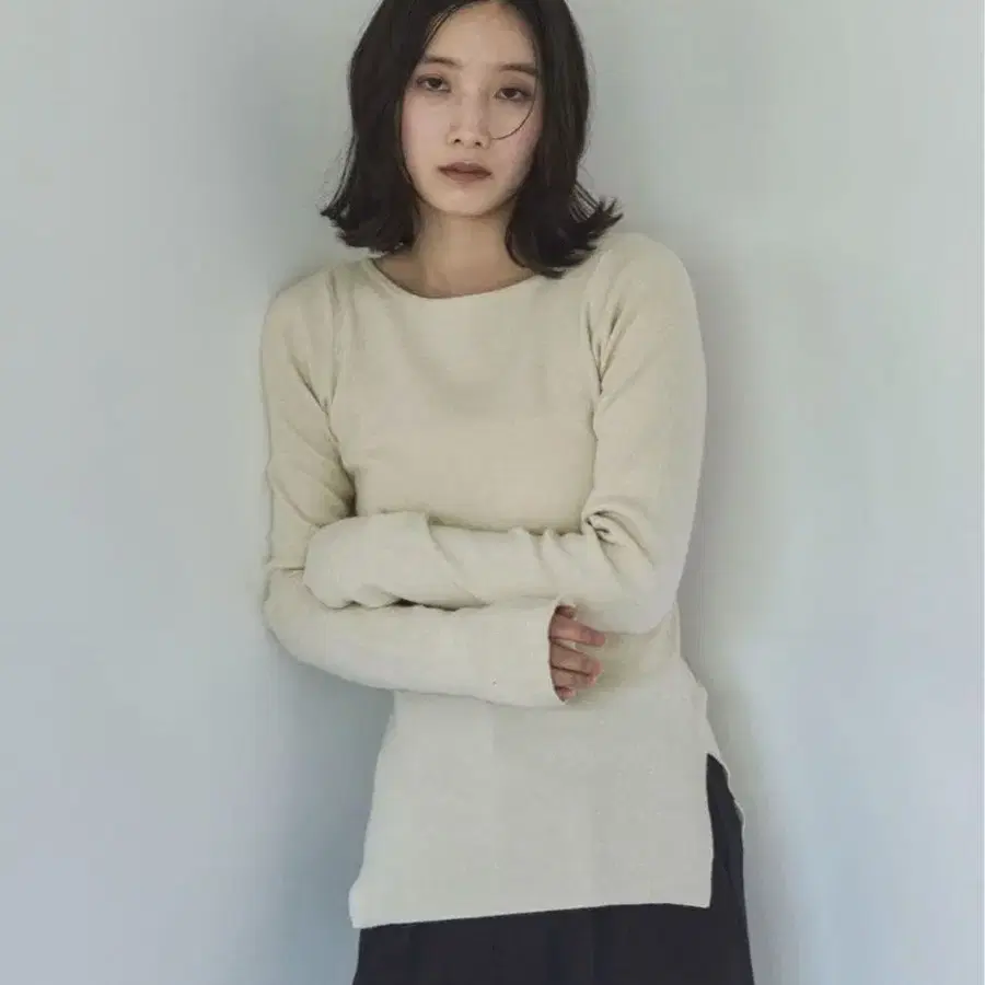 아이보리 색상의 긴팔 티셔츠, M 사이즈, 심플하고 돌려입기 좋은 디자인.