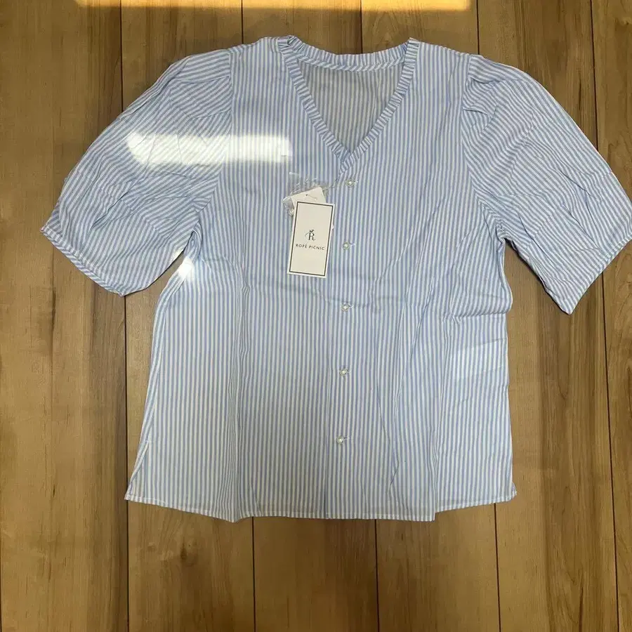 자동 번역되었어요. 원문보기[ 미사용 새상품 ‼️ ] 파랑과 화이트 스트라이프 디자인의 면 100% 셔츠, V넥과 버튼이 달린 반팔 스타일.