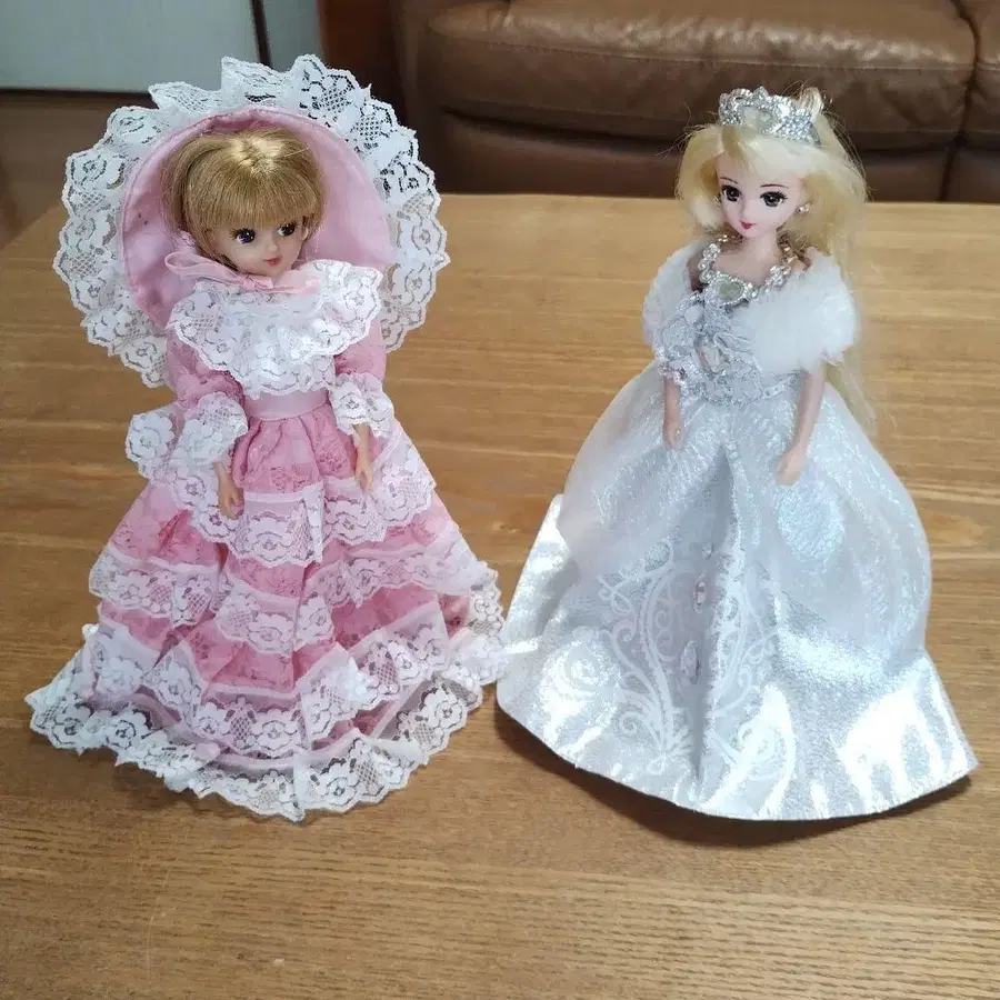 핑크와 화이트 레이스 드레스를 입은 리카짱 인형, 금발 머리와 티아라 포함.