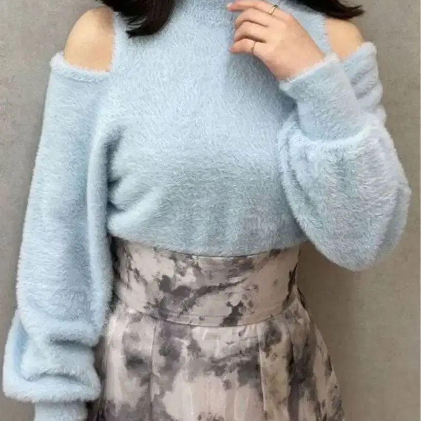 사이즈 - FREE SIZE MERCURY DUO 2WAY 니트 베스트 가디건 시어 프린트 티셔츠 오픈 숄더 미니 샤기 니트 라이트 블루 3종 세트입니다. 잘 부탁드립니다.