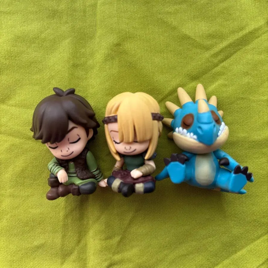 애니메이션 스타일의 캐릭터가 앉아 있는 피규어 3개 세트.