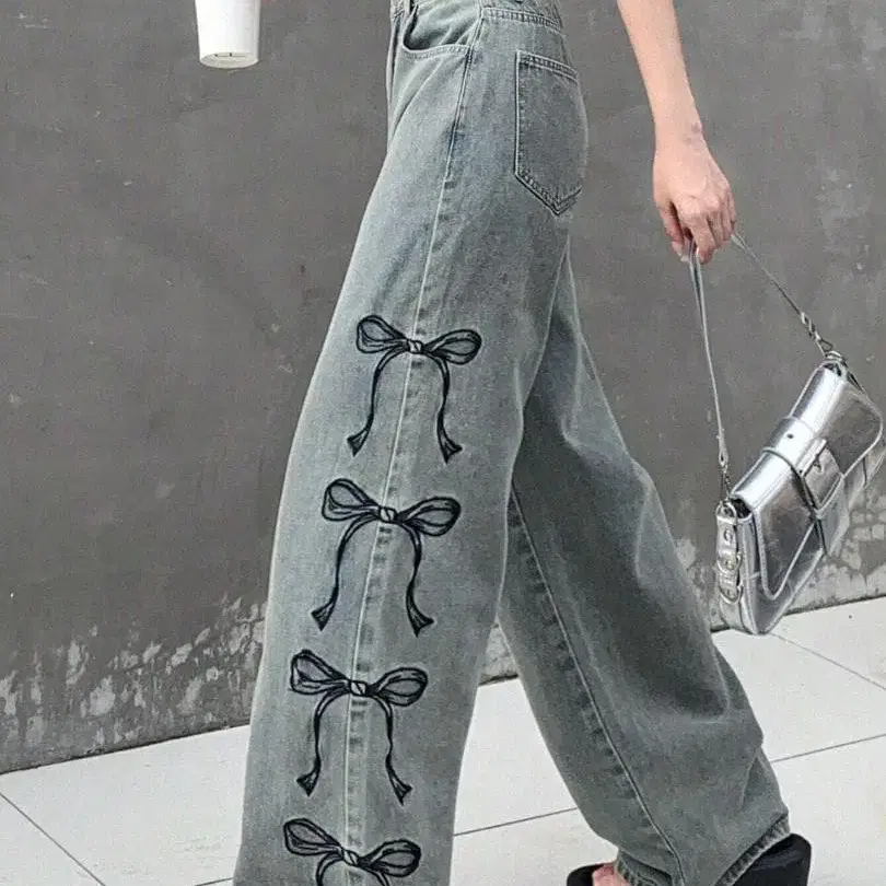 리본 무늬 와이드 레그 루즈 캐주얼 데님 팬츠 포켓 부착 여성용 진