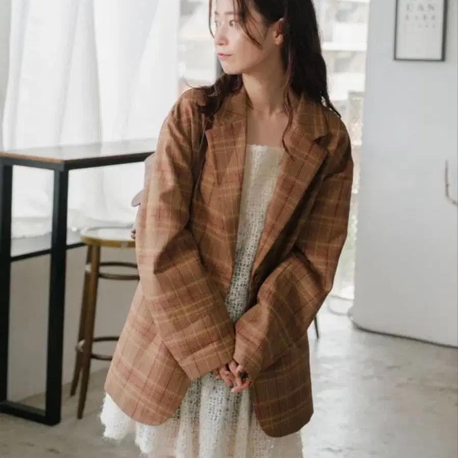 브라운 계열 체크 테일러드 자켓