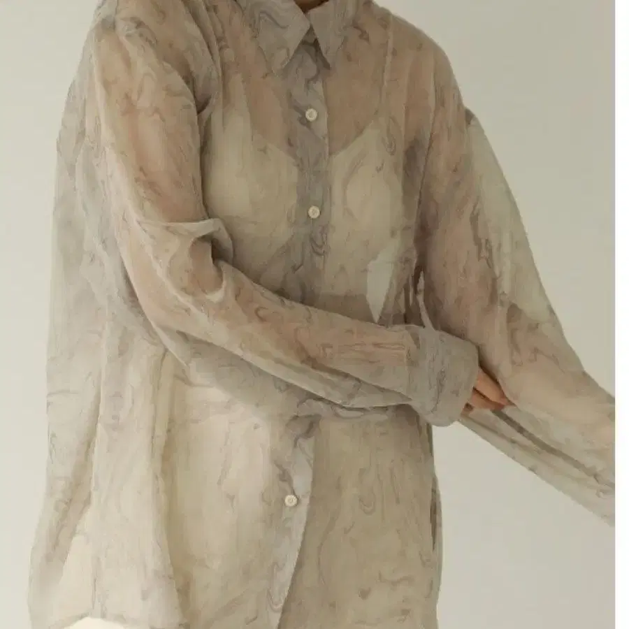 마블 패턴의 시어 셔츠. 적당한 비침이 있는 일본 국내산 쉬폰 원단을 사용했습니다. 적당히 여유 있는 사이즈감으로 힙까지 덮는 기장입니다. 원단이 얇아 허리 안으로 넣기 쉬우며, 하의 위에 걸쳐 입어도 귀엽습니다. 작은 버튼.